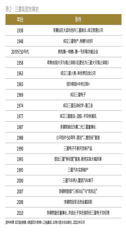 李秉于1938年成立三星集团前身——三星商会,主要进行水果和干鱼的出口(表2)。二战后,韩国政府邀请濑岛龙三为其发展献策。濑岛龙三说明了商社的重要性,建议韩国借此拉动出口。韩国由此大力提倡“综合商社模式”,将一些贸易公司合并为大型综合商社,三星也于1951年成立三星Moolsan(现为三星物产)——其被政府指定为“综合贸易商社1号”,成为韩国综合商社的先驱和样板。1959年,三星的秘书室也在濑岛龙三和李秉的引领下成立了。起初,秘书室是三星物产下的一个“课”(等同于中国的科级部门),只有20人,帮助会长处理日常事务。
