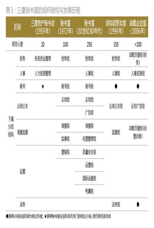 在三星的管理上,李秉把所有的日常事务交给下属,自己只做战略性的决策。同时,作为一家多元化经营的公司,三星子公司遍布世界各地,并且实施独立经营制度,需要一个强大的参谋组织作为内部的协调者,收集信息后做出企划和调整。于是,李秉参考三菱、三井和住友等日本财阀的秘书组织经验,于1972年加强了秘书室的功能,令其担负情报收集和分析、企划、日常事务管理等辅助功能(表3)。