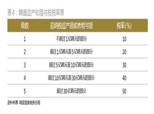 ●家族传承与税务筹划:从1994年开始,秘书室启动“经营权继承计划”,协助李健熙的长子李在镕接棒三星集团。秘书室的财务组和法务组的主要任务就是在传承的过程中,通过交叉持股的方法强化家族对企业的所有权。韩国对大额财产的继承者或受赠者收取高额遗产税和赠与税(表4),因此,“经营权继承计划”中也对李健熙的财产赠与进行设计,避免交付高达50%的财产赠与税。