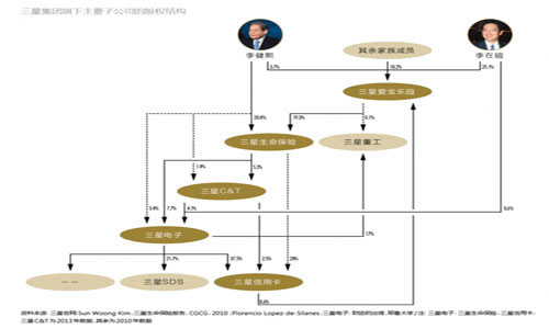 在大部分的亚洲企业里,通过金字塔持股或交叉持股结构,控股家族的控制权(表决权)通常大于现金流权。韩国财阀也不例外,其普遍通过复杂的交叉股权结构来保持控制权。在三星集团内部,李氏家族同样只持有集团子公司的少量股权,大约在1%-2%之间,却能牢固掌控整个集团(附图)。旗舰企业三星电子的最大股东是三星生命保险(持股7.7%),而三星生命保险的最大股东又是李健熙和三星爱宝乐园(分别持股20.8%和19.3%),三星爱宝乐园的最大股东是李在镕(持股25.1%),三星电子持有三星信用卡37.5%的股份,而三星信用卡又持有三星爱宝乐园8.6%的股份。通过这种交叉股权结构,李健熙和李在镕成为三星集团的实际控制人。