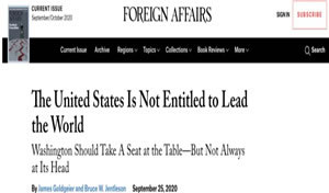 今天,美国早已不再独树一帜,也并非高居顶端,而是深处国际社会的漩涡中,既塑造国际事务和势力,也被国际事务和势力塑造。美国多年来一直让其他国家向自己学习,现在,到了美国向其他国家学习的时候了。新冠疫情已然暴露一个事实,即美国现在甚至不在谈判桌前。美国需要清醒地认识到,自己并不理所当然地领导世界。
