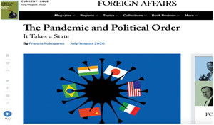 2020年6月9日,弗朗西斯·福山于《外交事务》杂志发表文章《大流行病与政治秩序:国家的不可或缺》(The Pandemic and Political Order: It Takes a State)。文中,福山重申了国家能力、社会信任和领导力作为国家要素对于危机管控的重要性和必要性。虽然疫情可能导致美国的相对衰落、自由国际秩序受到侵蚀以及法西斯主义的抬头,但一战和大萧条也造就了民主、福利国家和崛起的美国。