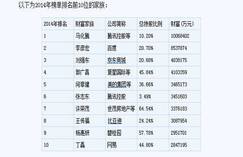 理财周报第七次发布《3000中国家族财富榜》,2014年度《3000中国家族财富榜》中,前三甲均为互联网行业家族,分别为: