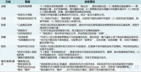 “衣食住行“中,“衣”主要在阿里基础电商部分,“食住行”可笼统概括在O2O业务布局之中。2013年底,淘宝推出移动餐饮服务平台“淘点点”,2014年10月底,淘宝旅行分拆独立“去啊”。除了以上两者是阿里亲自操刀外,其他O2O业务都是通过战略投资或收购来进行。