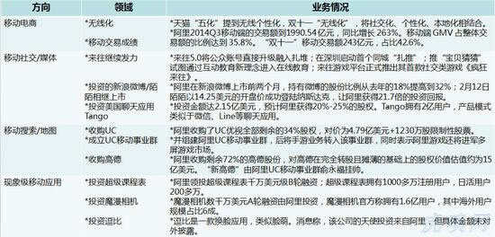如果细数投资数量,2014年阿里在移动领域投资案例少于前两年,最大手笔投入在UC和高德的两次全资收购上,两者并入阿里后成立新的移动事业群区别于此前阿里无线事业,移动事业群偏向移动(端)入口的布局。